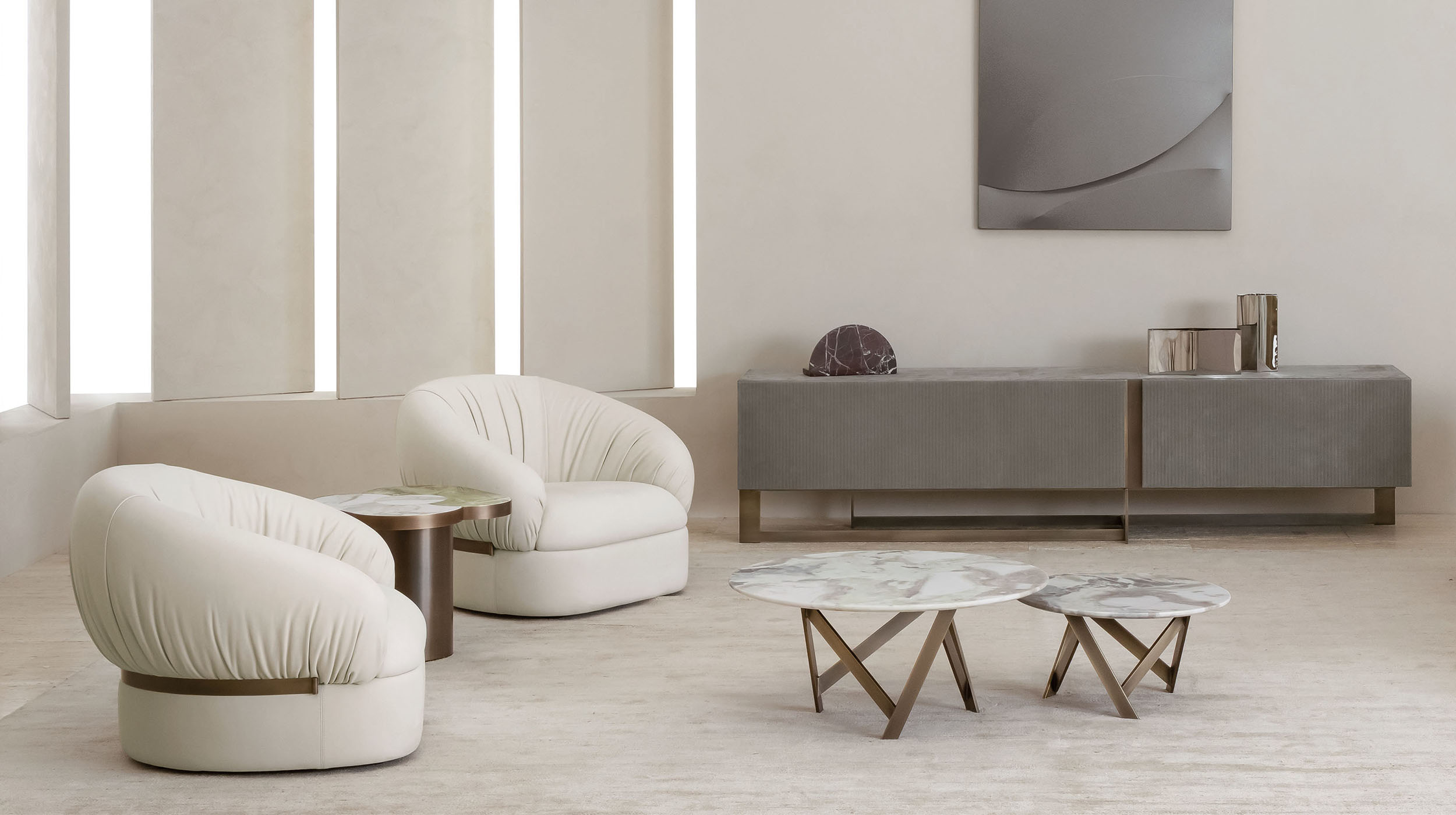 Le superfici imbottite, generose e calibrate, si distinguono per il ritmo di leggere tensioni e drappeggi che animano il rivestimento, creando un effetto tattile e visivo ricercato. La silhouette rotonda e compatta accompagna la seduta in un equilibrio tra morbidezza e rigore progettuale, mentre ogni curva esprime l’idea di un relax contemporaneo, caldo e sofisticato.