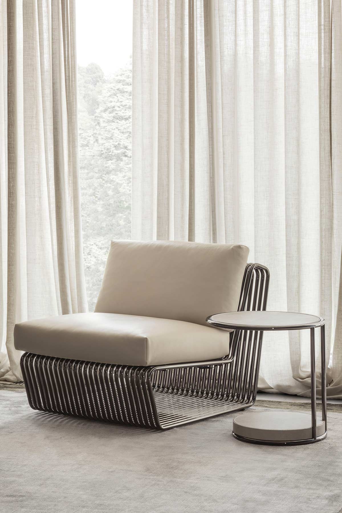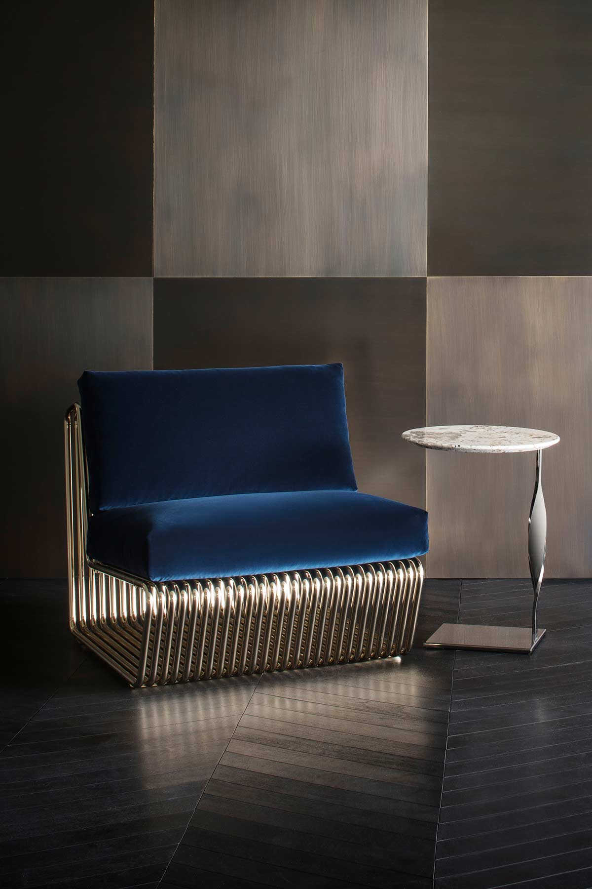 La serie di tubolari accostati e curvati da vita alla seduta, resa confortevole dai cuscini seduta e schienale. Struttura disponibile in oro lucido o cromo nero.
