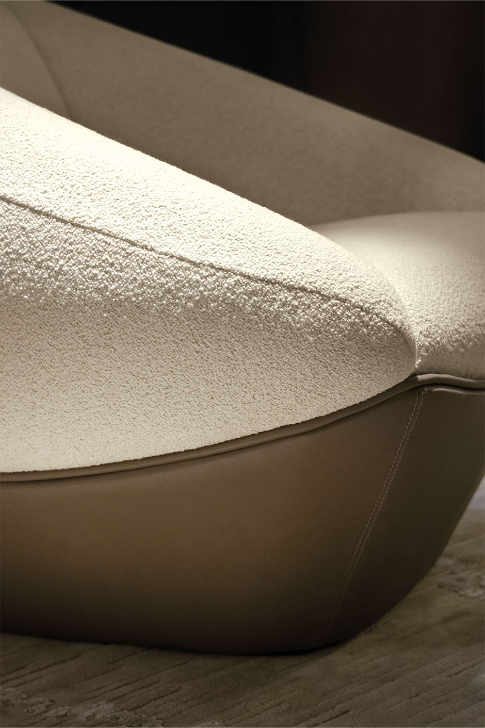 Le curve avvolgenti definiscono una forma accogliente, pensata per offrire una postura rilassata e al tempo stesso sostenuta. Il rivestimento bicolore enfatizza il disegno scultoreo della poltrona e ne sottolinea la doppia anima: solida nella parte inferiore, morbida e vellutata in quella superiore. Ogni dettaglio, dalle cuciture sartoriali al gioco di materiali, testimonia la maestria artigianale e la ricerca progettuale che definiscono l’identità Rugiano.