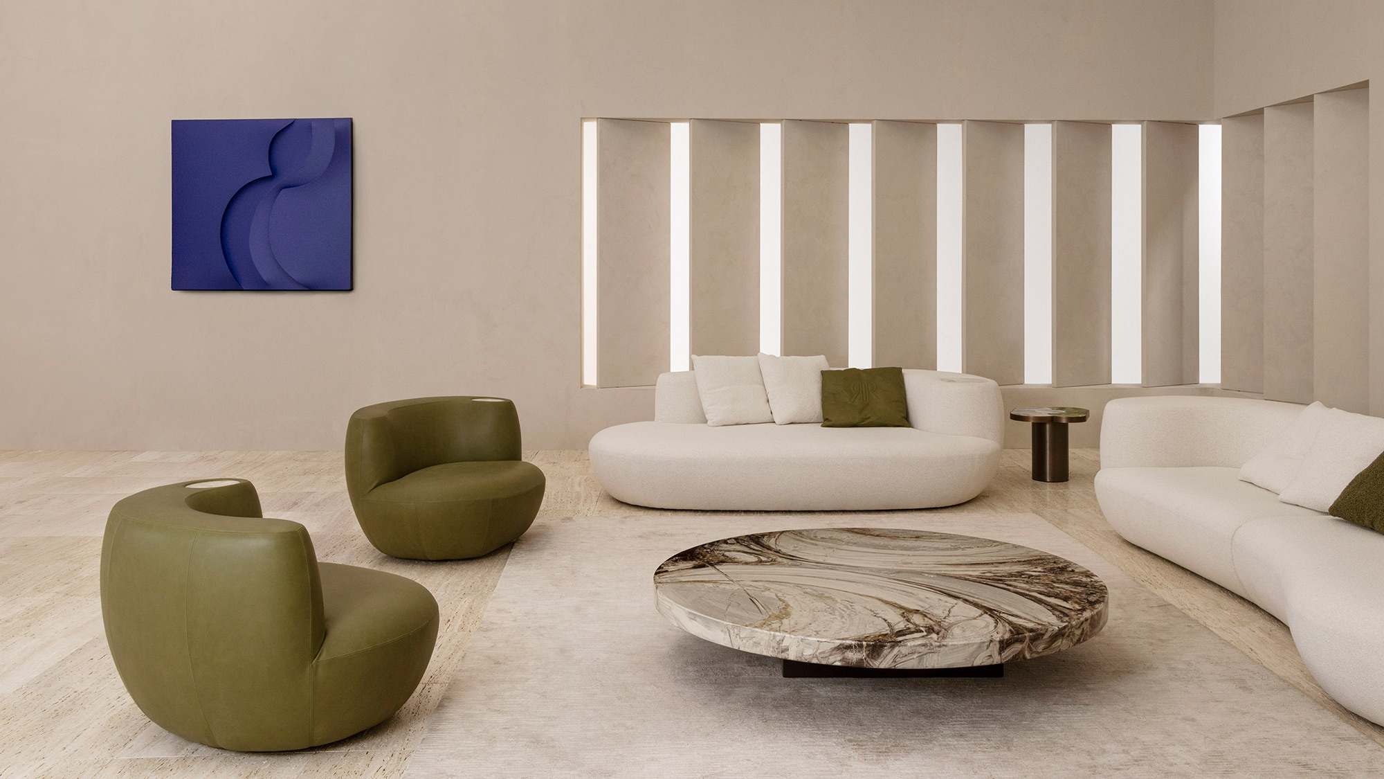 Completamente rivestita in pelle o tessuto, Rafael si distingue per l’equilibrio tra estetica e funzionalità, con proporzioni studiate per offrire una seduta rilassata ma contenuta. Il dettaglio più iconico è l’inserto in marmo naturale integrato nello schienale: una presenza materica preziosa che impreziosisce la struttura, conferendo unicità e prestigio.