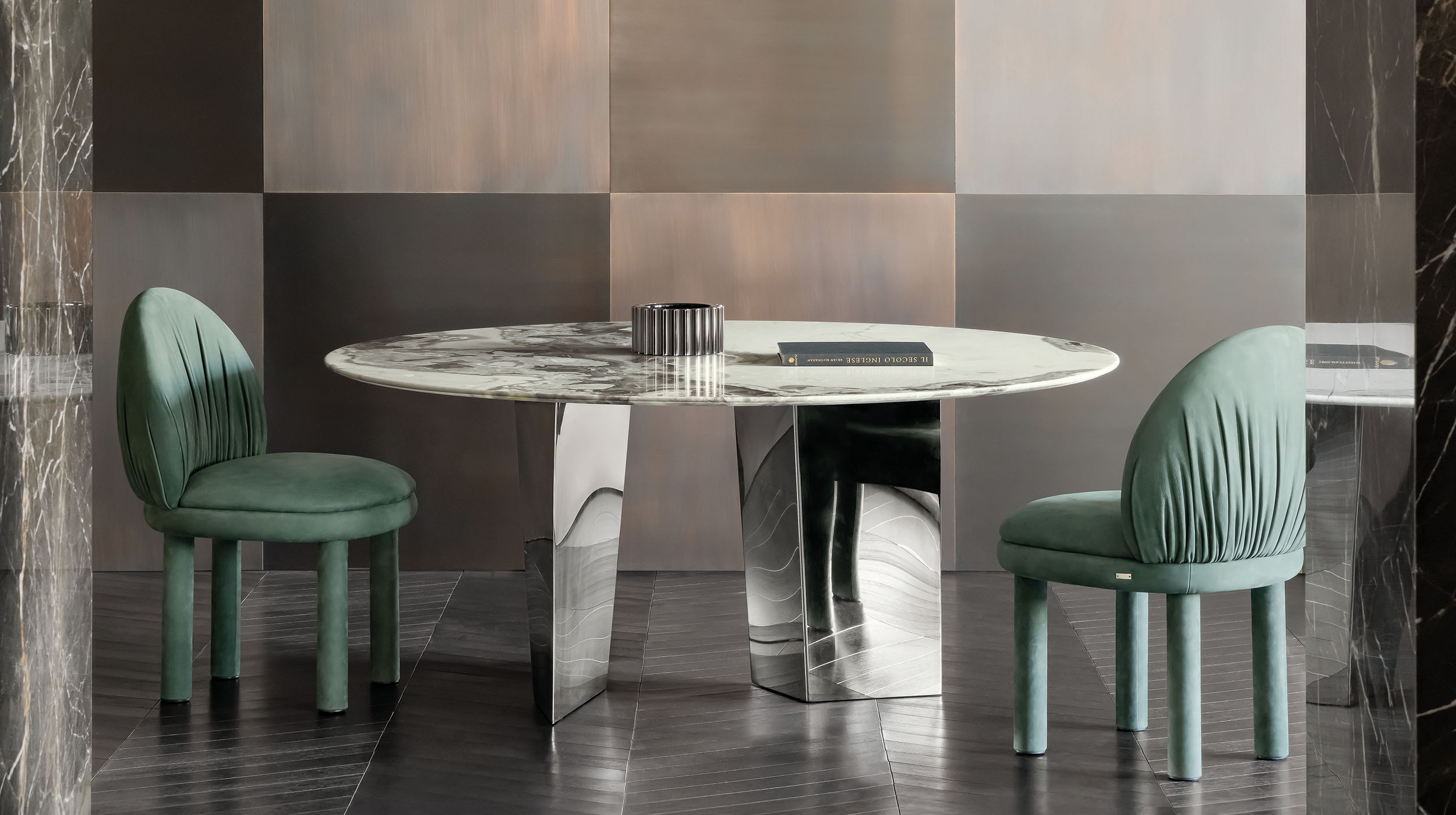 La seduta generosa e l’impostazione raccolta creano un comfort immediato, pensato per accompagnare con discrezione sia la convivialità sia i momenti più intimi. Le pieghe verticali, calibrate e fluide, diventano un segno decorativo misurato, capace di valorizzare la matericità del rivestimento e di restituire quella sensazione di “pezzo su misura” tipica della lavorazione artigianale Rugiano. Ogni dettaglio è progettato per mantenere un equilibrio tra presenza scenica e sobrietà, trasformando una sedia in un elemento di stile.