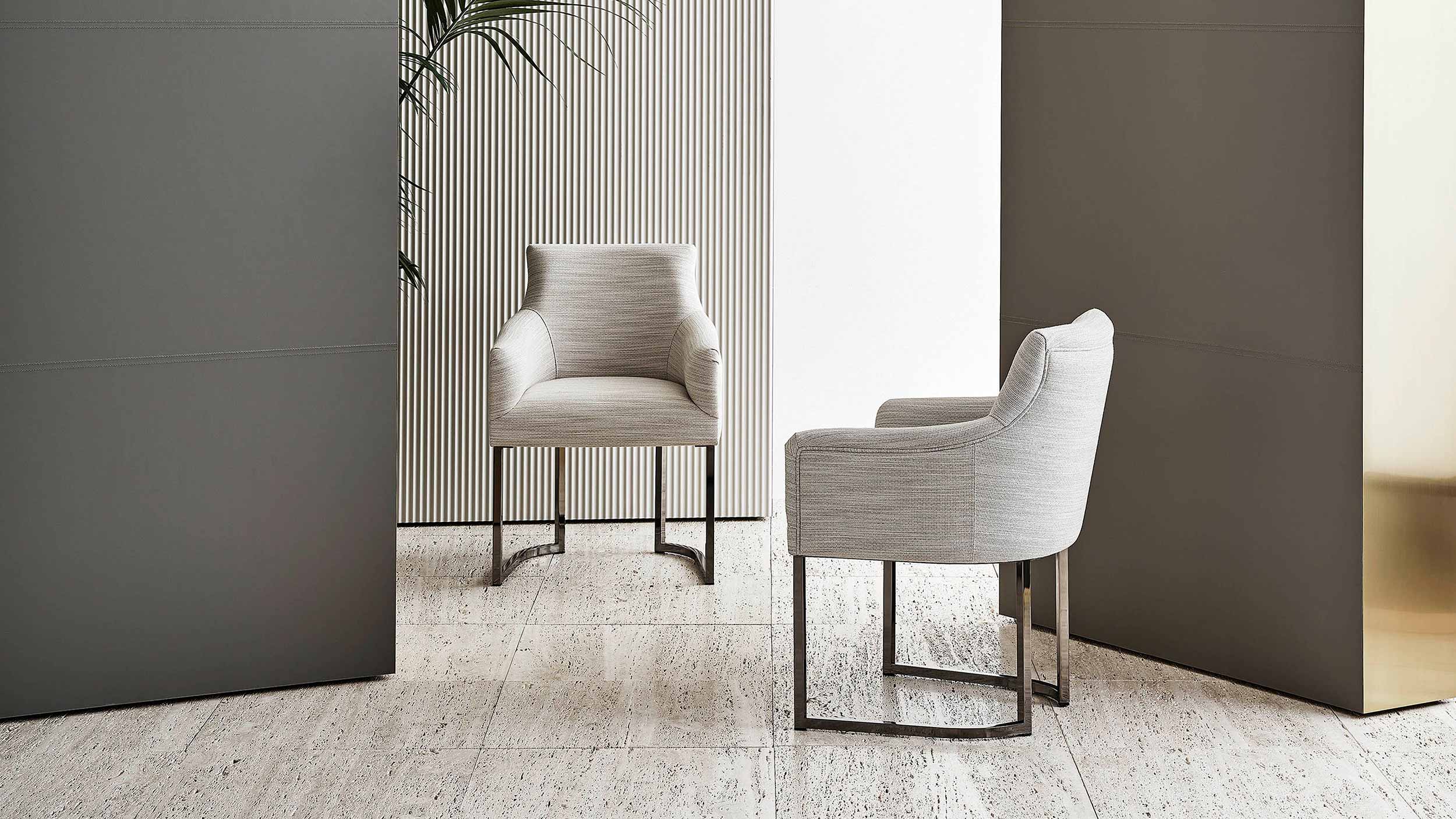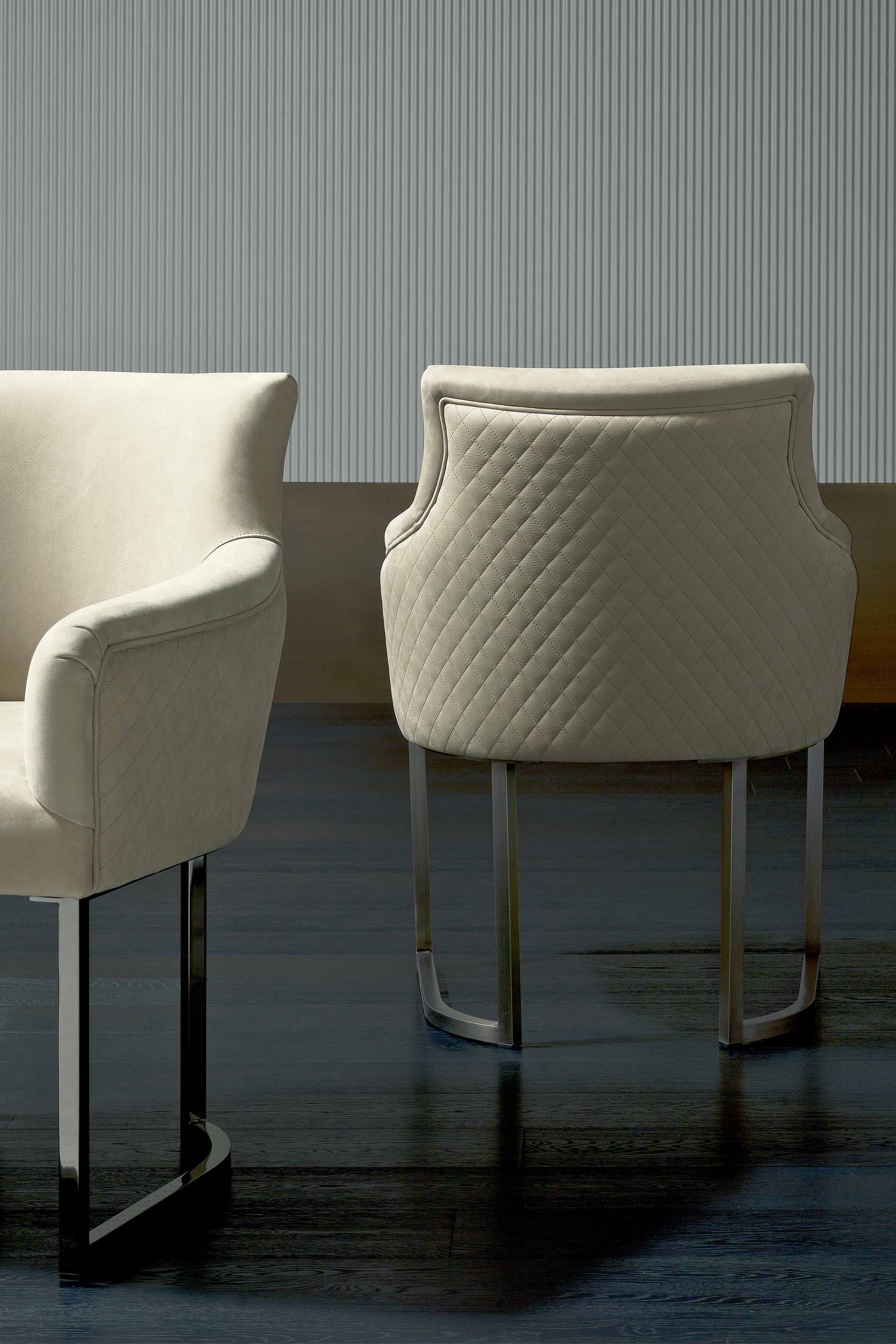 Sedia rivestita con gambe in metallo. Disponibile anche la versione con schienale capitonne o con retro e scocca rivestite in pelle stampata.