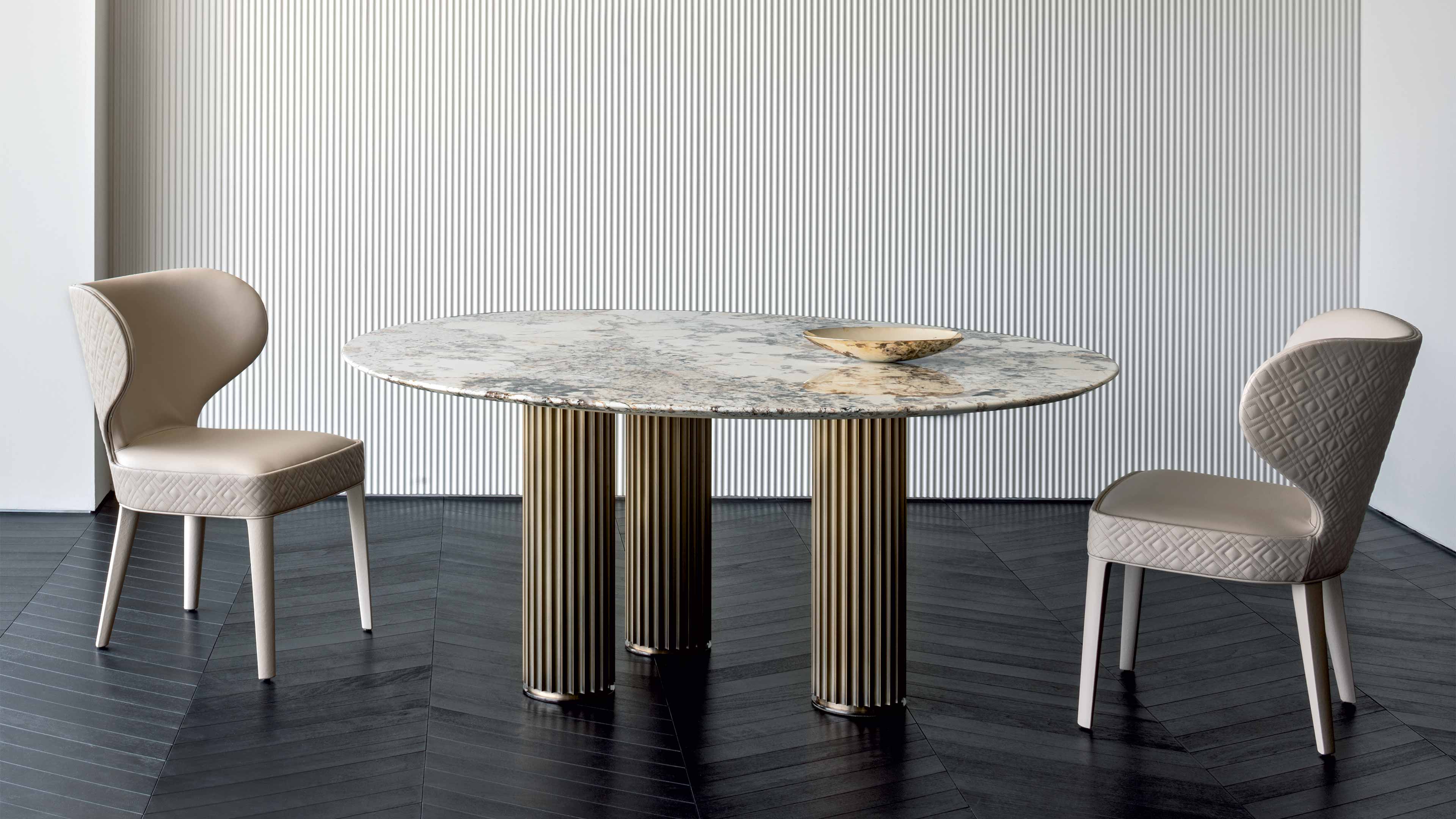 Piano tondo per la monobase, mentre la base a tre colonne a il piano ovale. I piani sono disponibili in marmo o decorati.