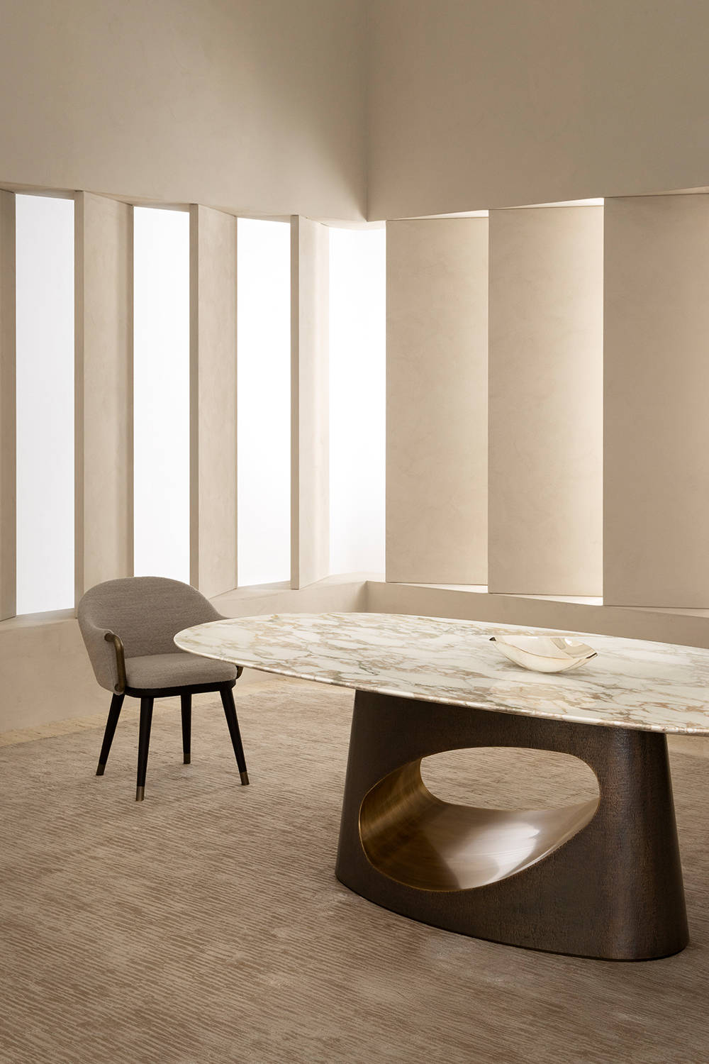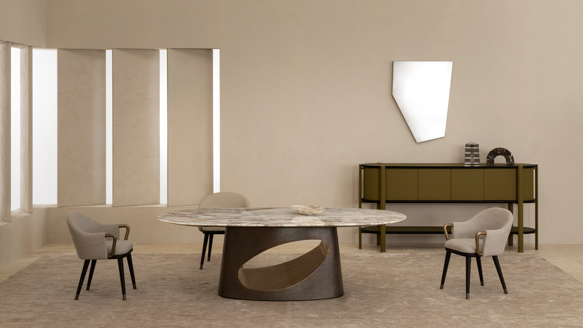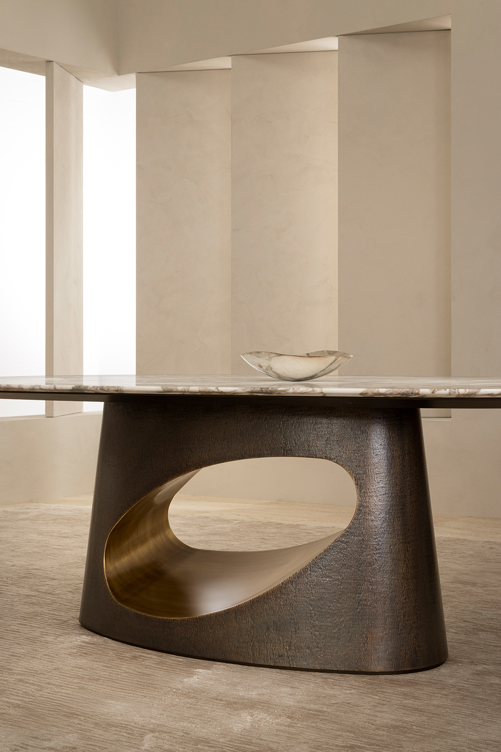 Il tavolo Ring si impone con una presenza scenografica, dove la forza del metallo incontra l’eleganza della pietra. La base, realizzata in ottone bronzato martellato a mano, si distingue per la sua forma scultorea e dinamica: un volume pieno che si svuota attraverso un’apertura ovale, creando un gioco di luce, vuoto e riflessi che dona leggerezza visiva a una struttura monumentale.