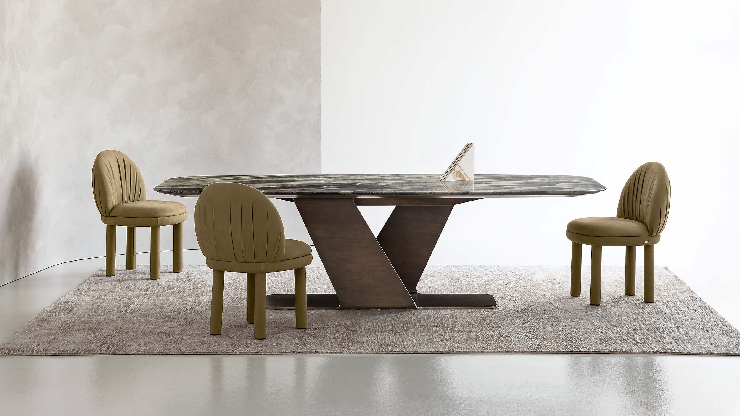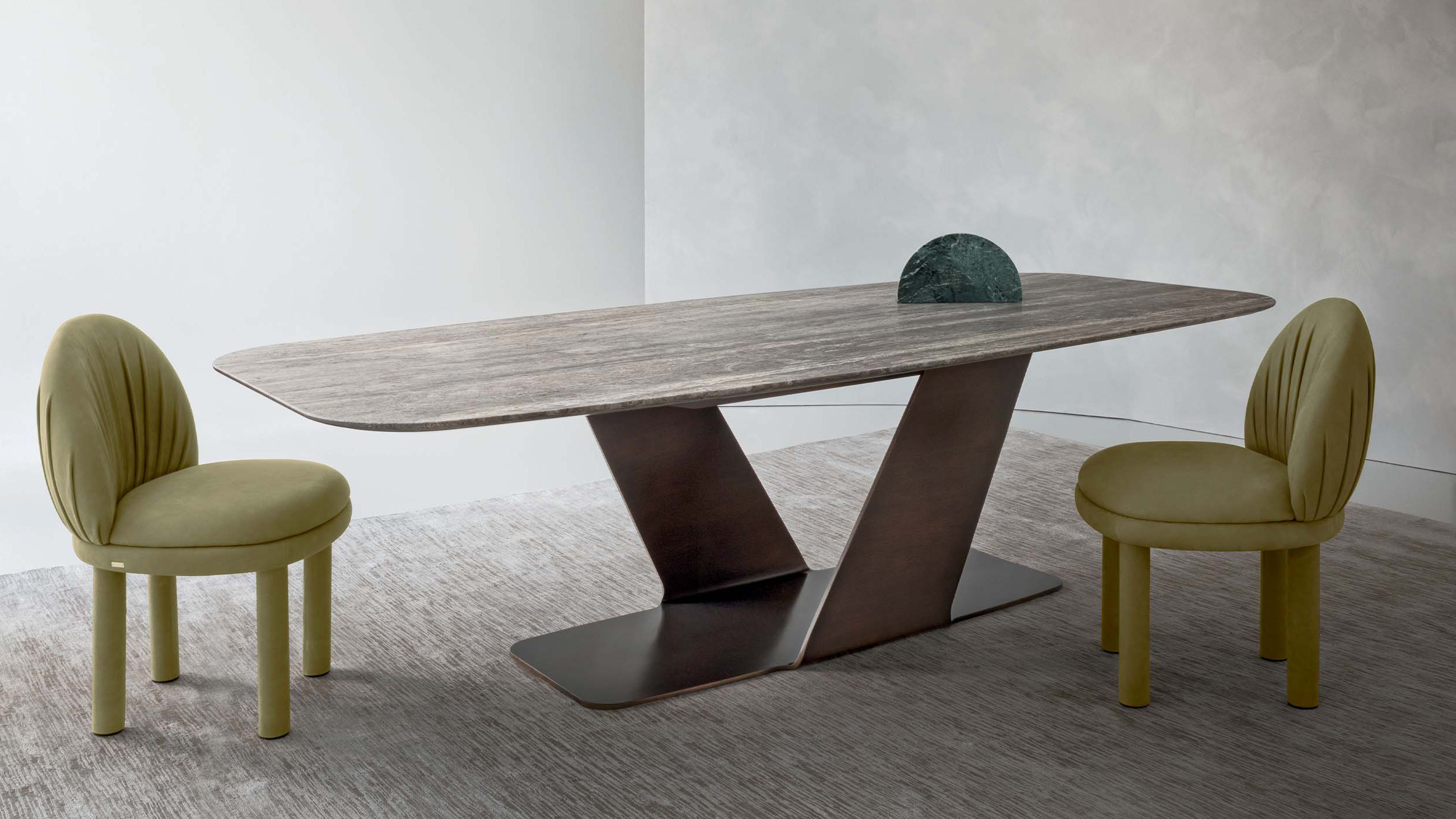 Abili tecniche costruttive si fondono al design per dar vita ad una base scultorea arricchita da diverse tipologie di piani in pietra naturale e nel caratteristico Decoro Rugiano.