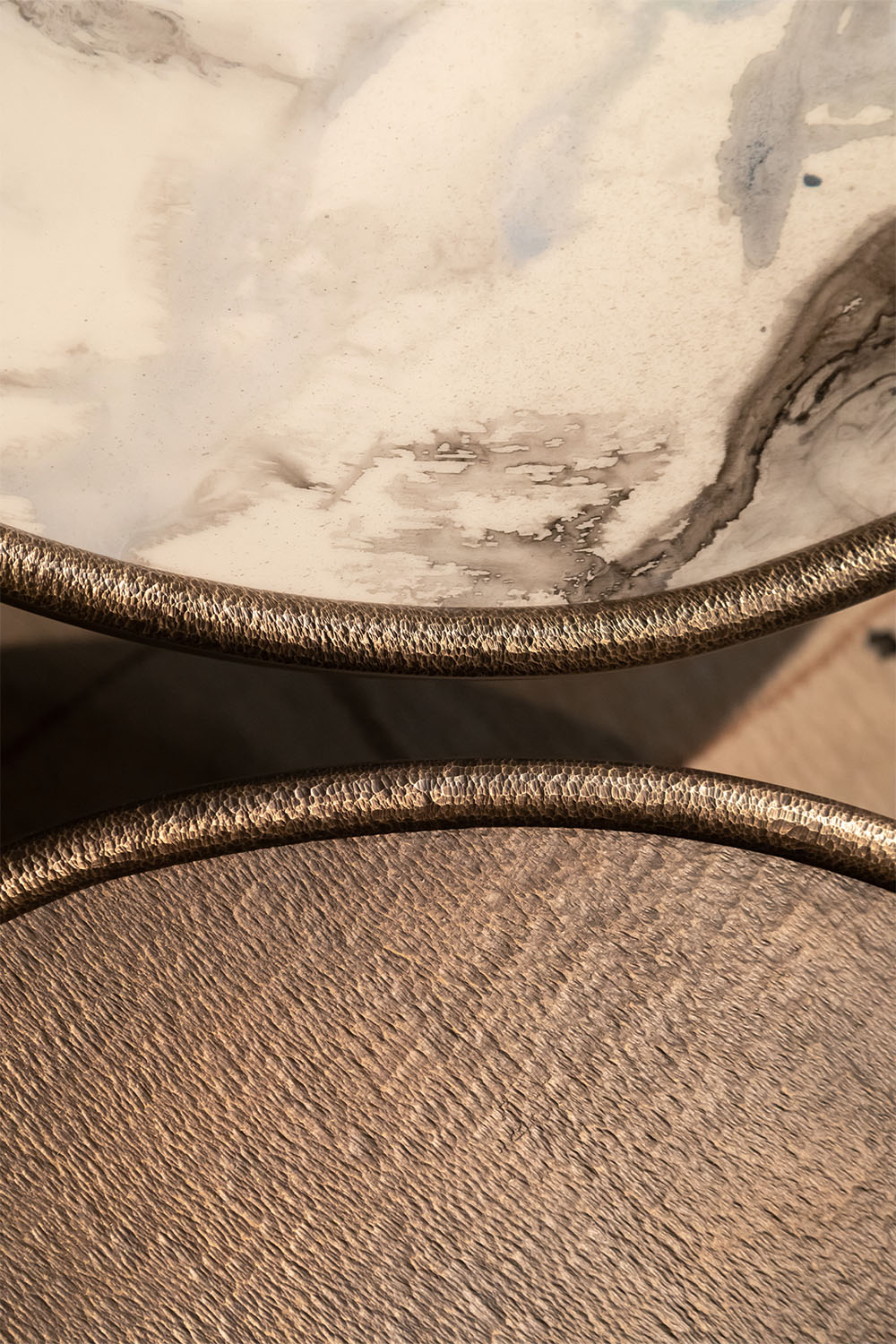 La base scultorea in metallo bronzo martellato a mano sostiene un piano disponibile in più varianti: la versione in bronzo martellato continua il linguaggio materico in modo monolitico e armonioso; una versione con top in decoro, unica per ogni pezzo, evoca affascinanti forme astratte grazie a sfumature fluide e naturali; infine, una versione con top in pietra completa la proposta con un’estetica solida e senza tempo.