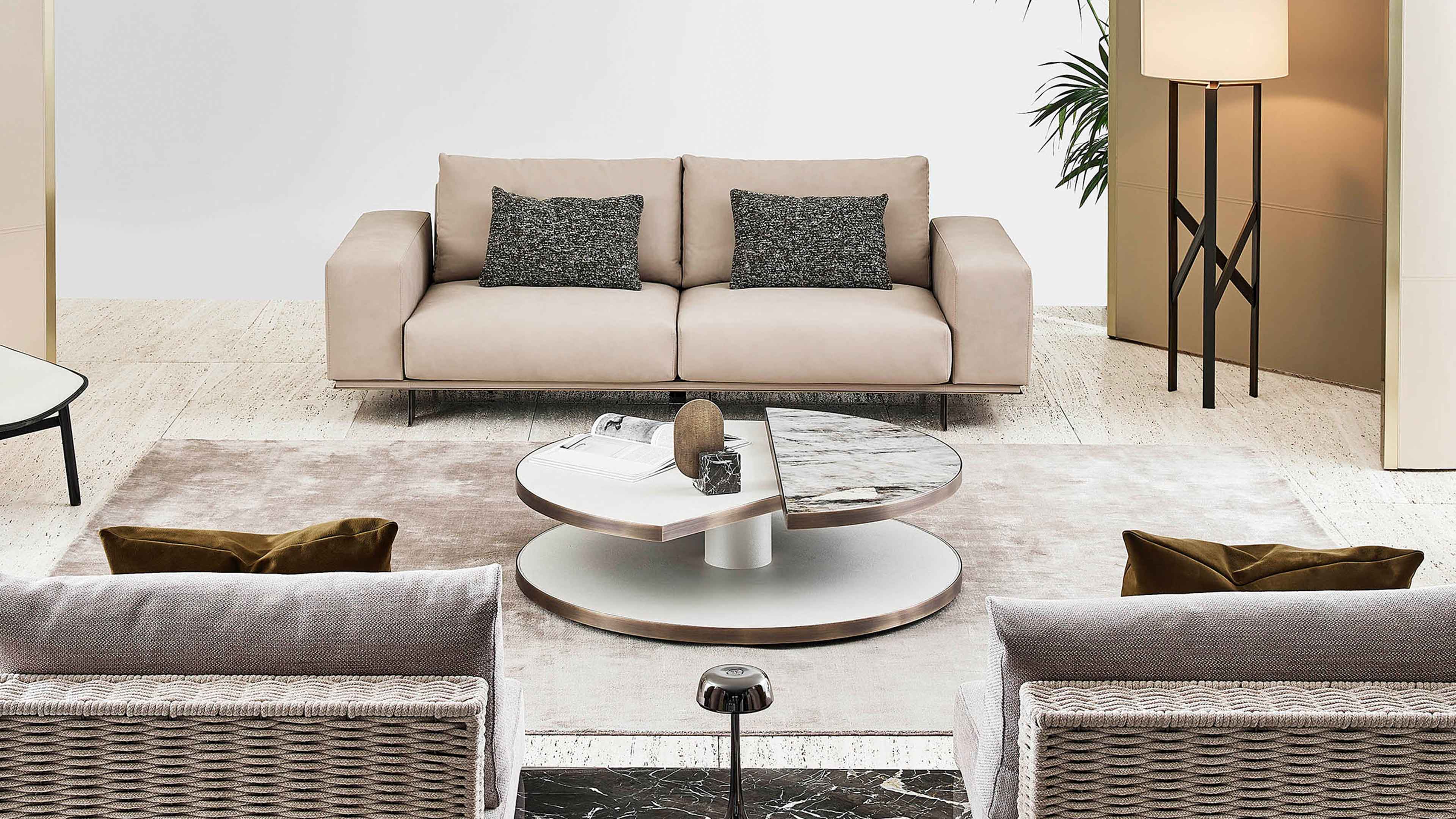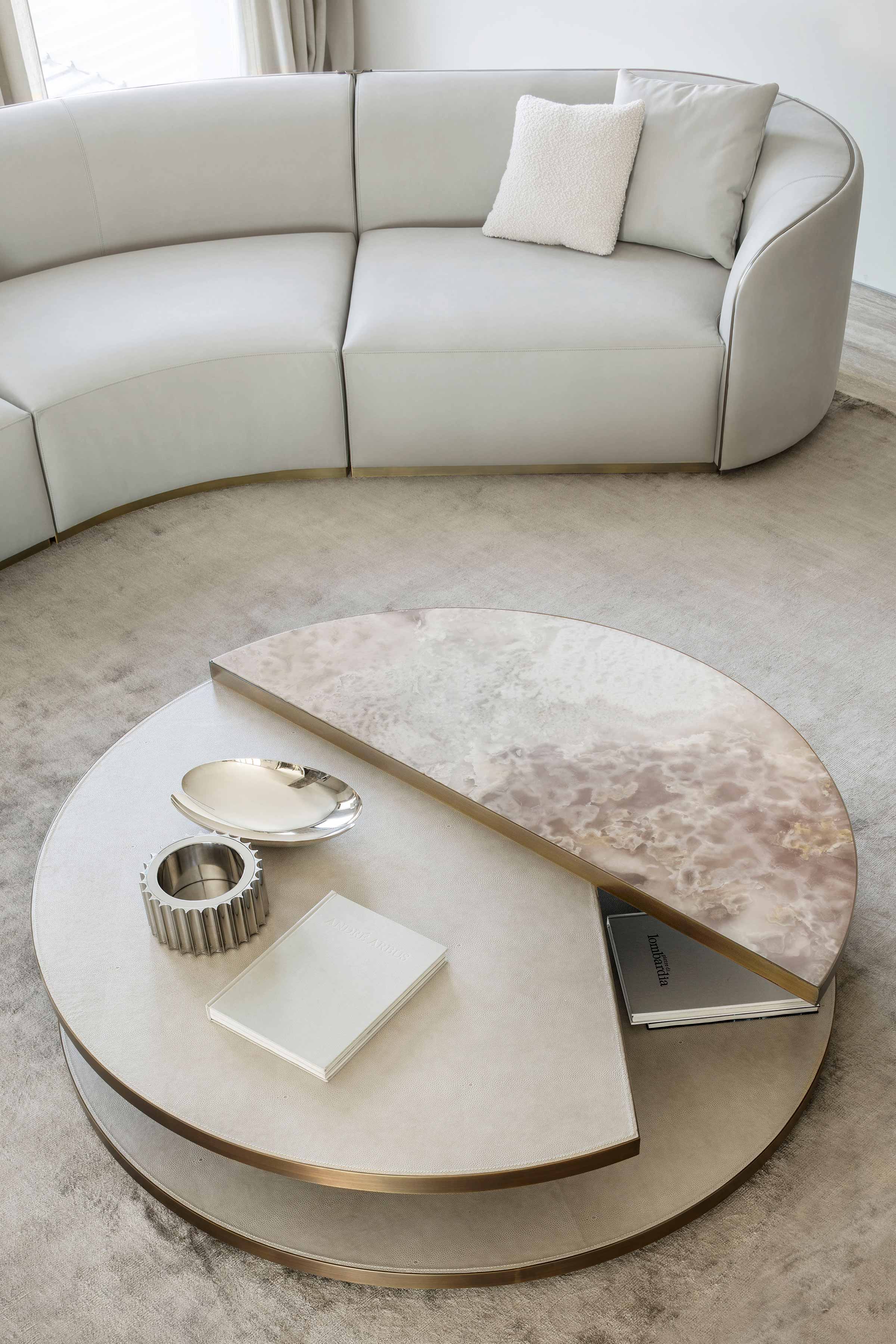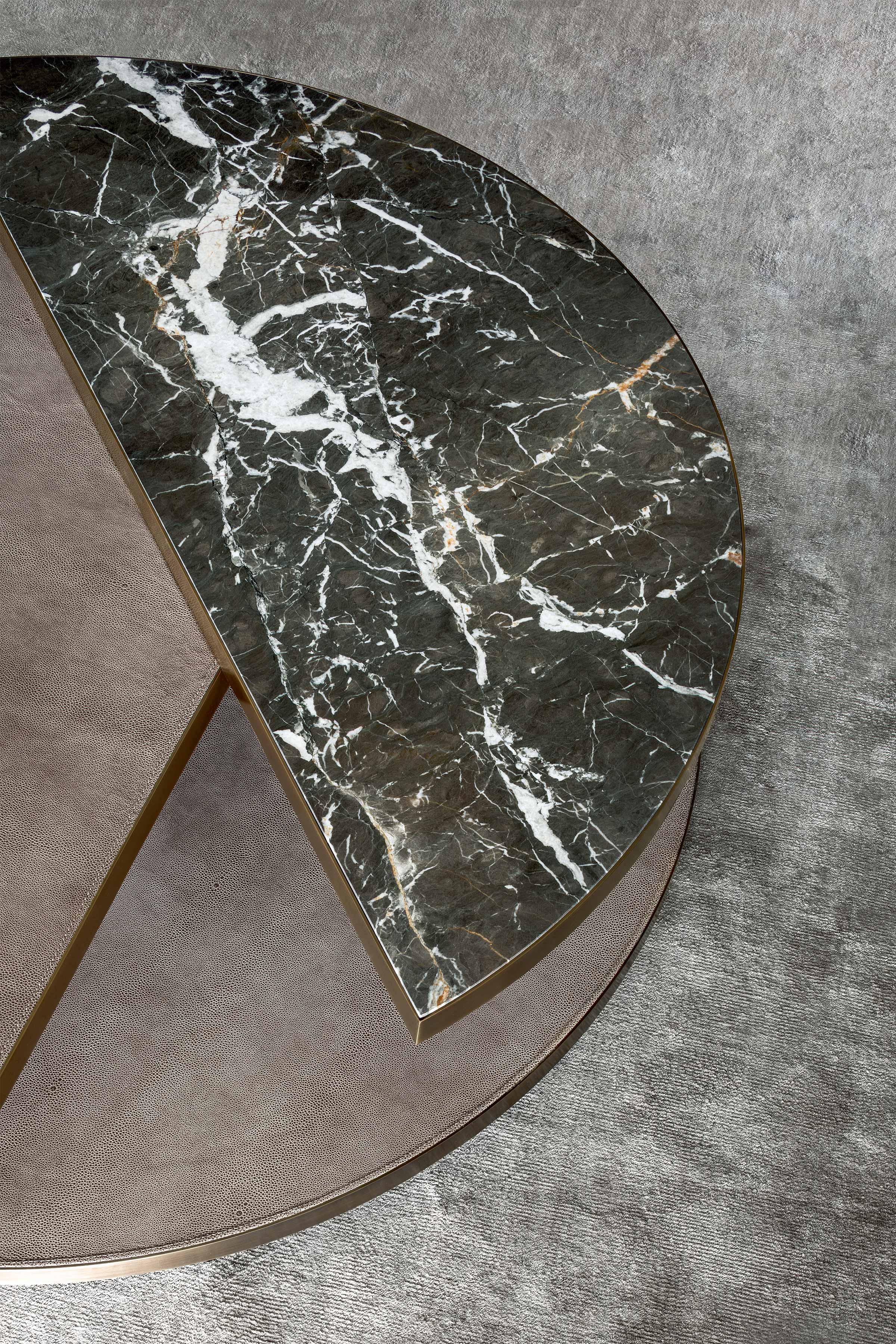 Forma tonda e diversi livelli per i piani superiori, tutti con profili in bronzo, disponibili nella combinazione pelle e marmo o ebano e pelle.