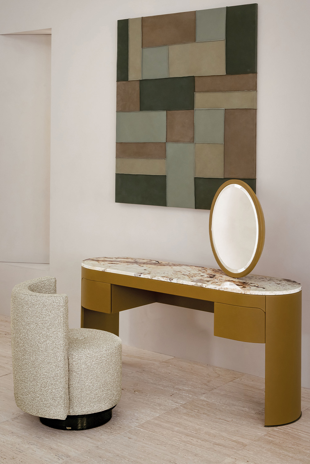 Una silhouette armoniosa e raffinata definisce la toeletta Vogue, elemento iconico pensato per interpretare il quotidiano con un gesto di stile. Le forme curve, il profilo dolcemente stondato e lo specchio rotondo integrato conferiscono alla composizione una presenza scenografica ma discreta, capace di arricchire l’ambiente con naturalezza.