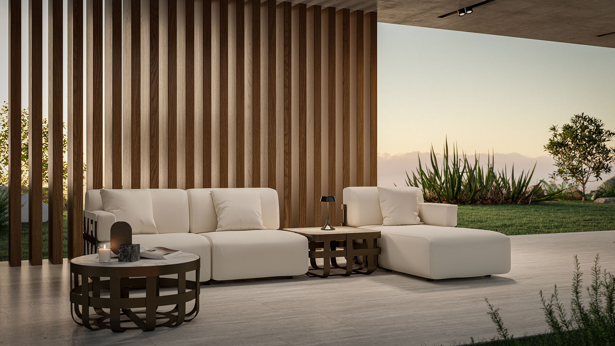 La struttura in alluminio outdoor, leggera ma straordinariamente solida, è definita da fasce metalliche bronzo che si intrecciano sul lato e sul retro, creando un raffinato disegno grafico tridimensionale. Questo dettaglio non solo valorizza il profilo architettonico della chaise longue, ma aggiunge una nota decorativa e contemporanea, tipica del design Rugiano.