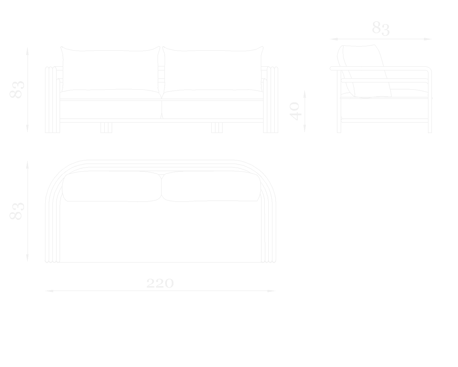Capri è il divano che porta il segno distintivo del design Rugiano anche all’esterno. La sua struttura geometrica, realizzata in alluminio outdoor verniciato e curvato con precisione, sorregge volumi generosi e imbottiture morbide, dando vita a un equilibrio visivo tra forza architettonica e comfort avvolgente.