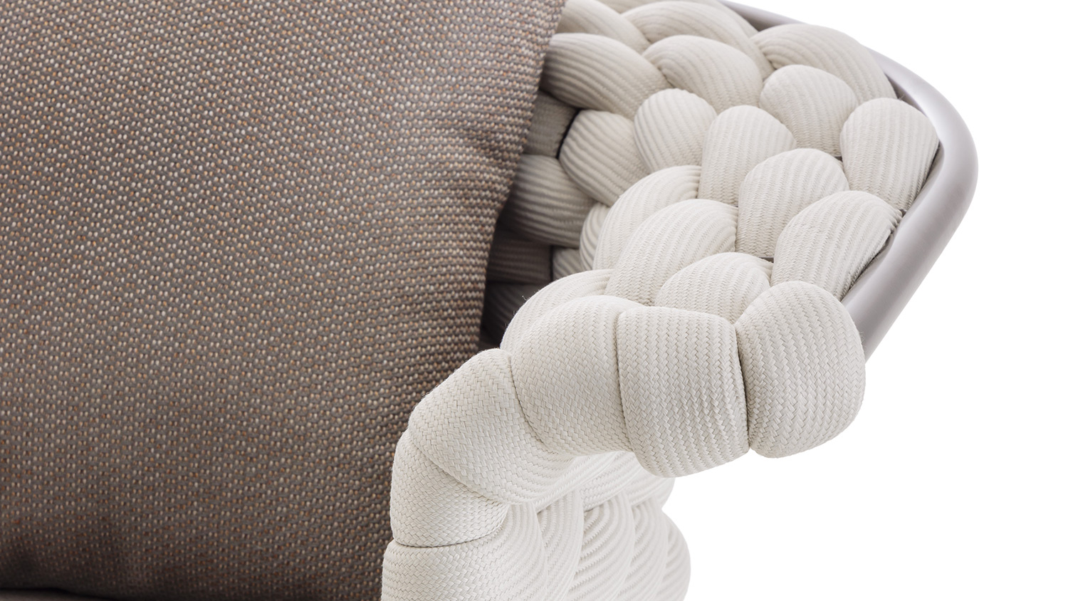 Marina Soft è l’evoluzione più avvolgente della collezione Marina, che reinterpreta l’intreccio iconico Rugiano con un linguaggio più fluido e materico. Il protagonista di questa versione è il tubolare, che corre lungo tutta la struttura in metallo bronzo outdoor con un gesto continuo e scultoreo, dando vita a una tessitura tridimensionale dal carattere morbido e sofisticato.