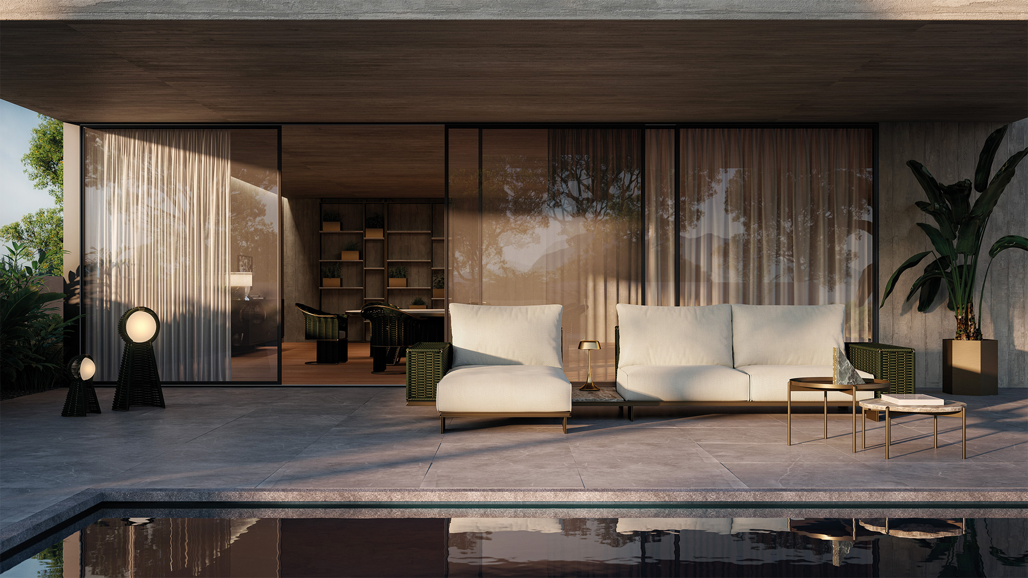 La struttura in alluminio bronzo outdoor, leggera ma solida, crea un equilibrio armonioso tra forza costruttiva e sobrietà estetica.