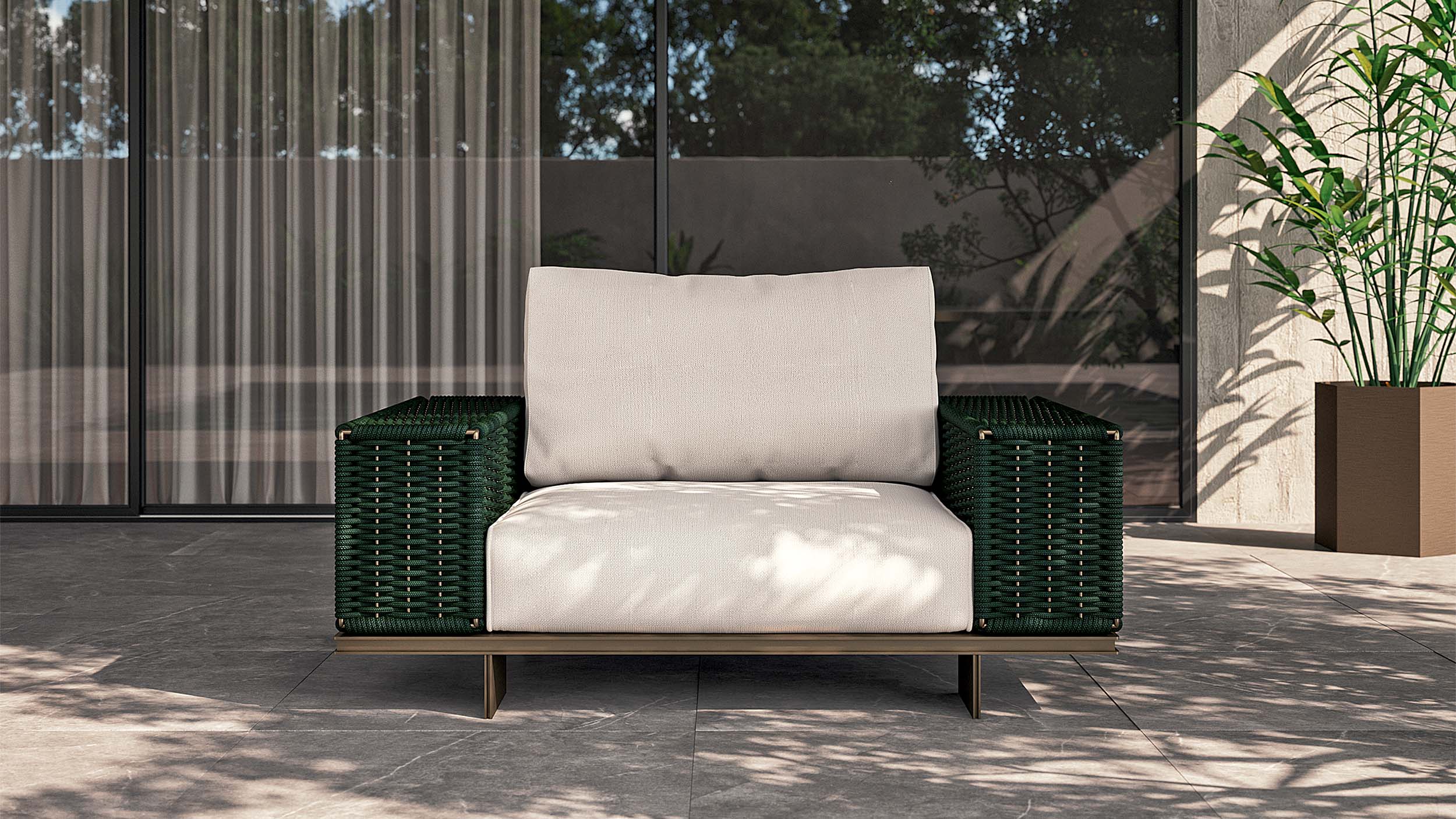 Ogni dettaglio della lavorazione artigianale esalta l’identità formale del progetto, trasformando un elemento funzionale in un oggetto d’arredo dall’estetica riconoscibile e raffinata. La cuscinatura, morbida e generosa, garantisce un comfort elevato anche in contesti outdoor esigenti.