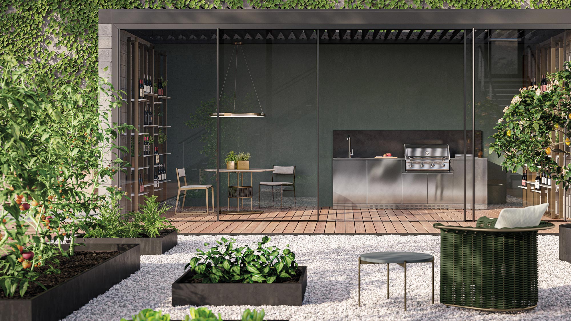 Il suo profilo, definito da linee tese e volumi essenziali, si distingue per una base grafica in alluminio bronzo outdoor, solida ma visivamente leggera.
