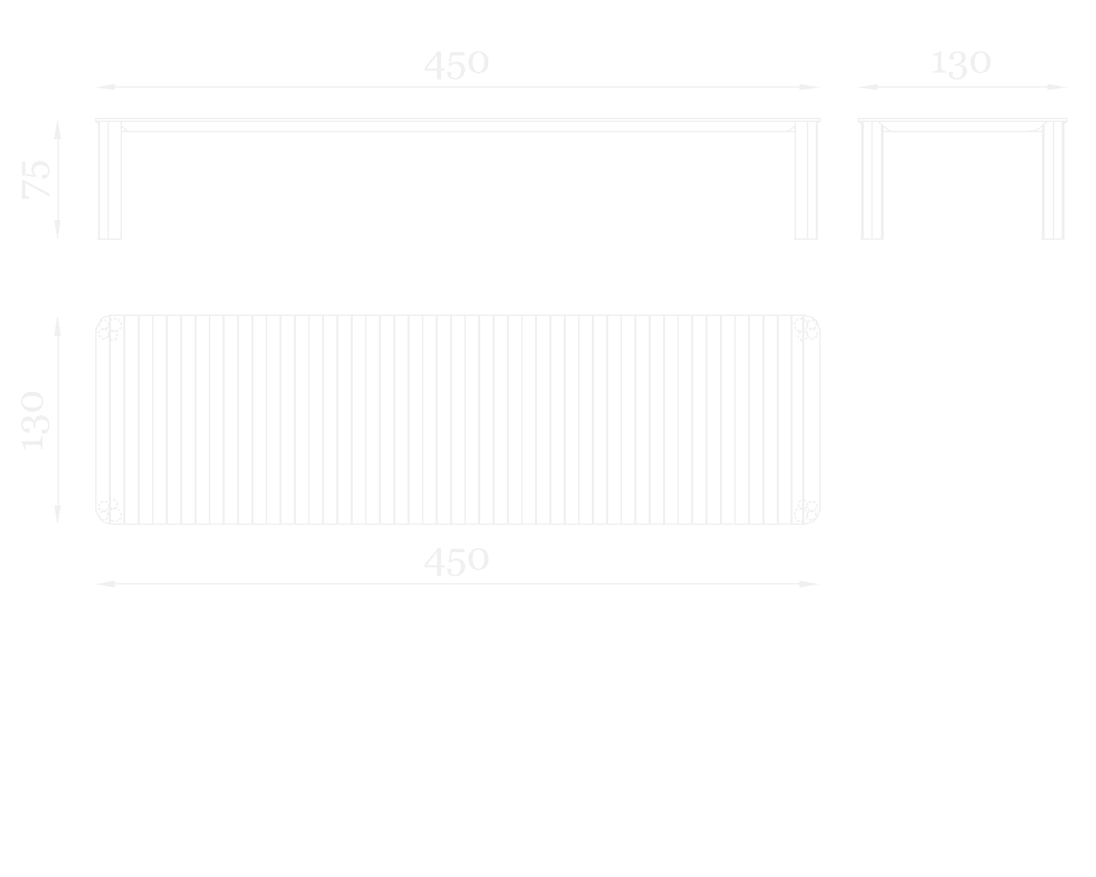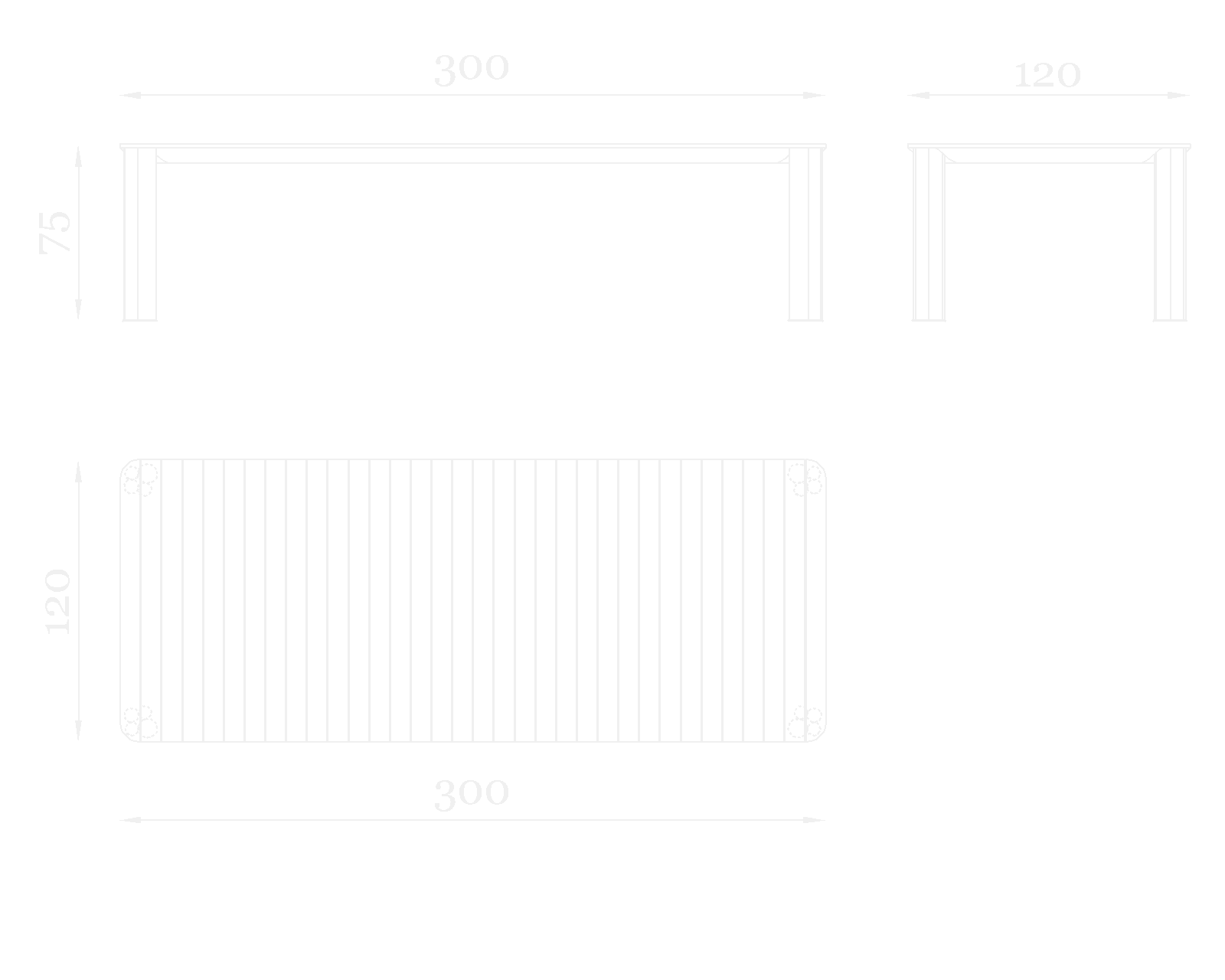 Un oggetto che, pur nella sua essenzialità, diventa una presenza scenografica e un punto focale nello spazio aperto. La base è costituita da due elementi monolitici, disponibili in legno o pietra naturale, sagomati con taglio geometrico per offrire solidità e impatto visivo. Il loro disegno scultoreo evoca stabilità e forza, in netto contrasto con la purezza formale del piano. Il top, disponibile in marmo tecnico o legno a doghe, è caratterizzato da uno spessore importante e da bordi leggermente stondati, pensati per esaltare la matericità della superficie e aggiungere morbidezza visiva alla composizione.