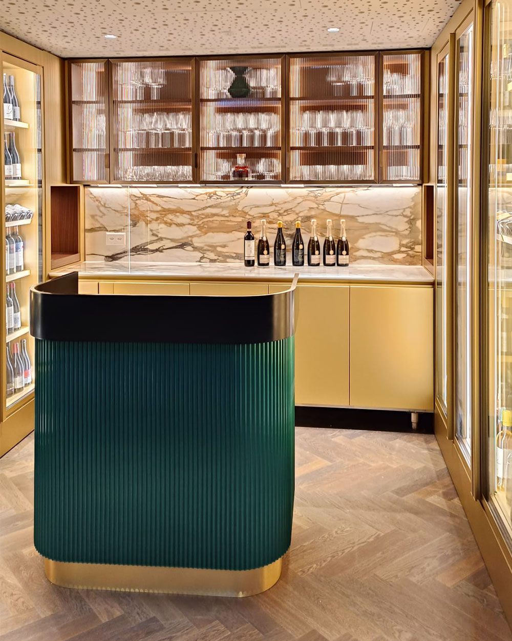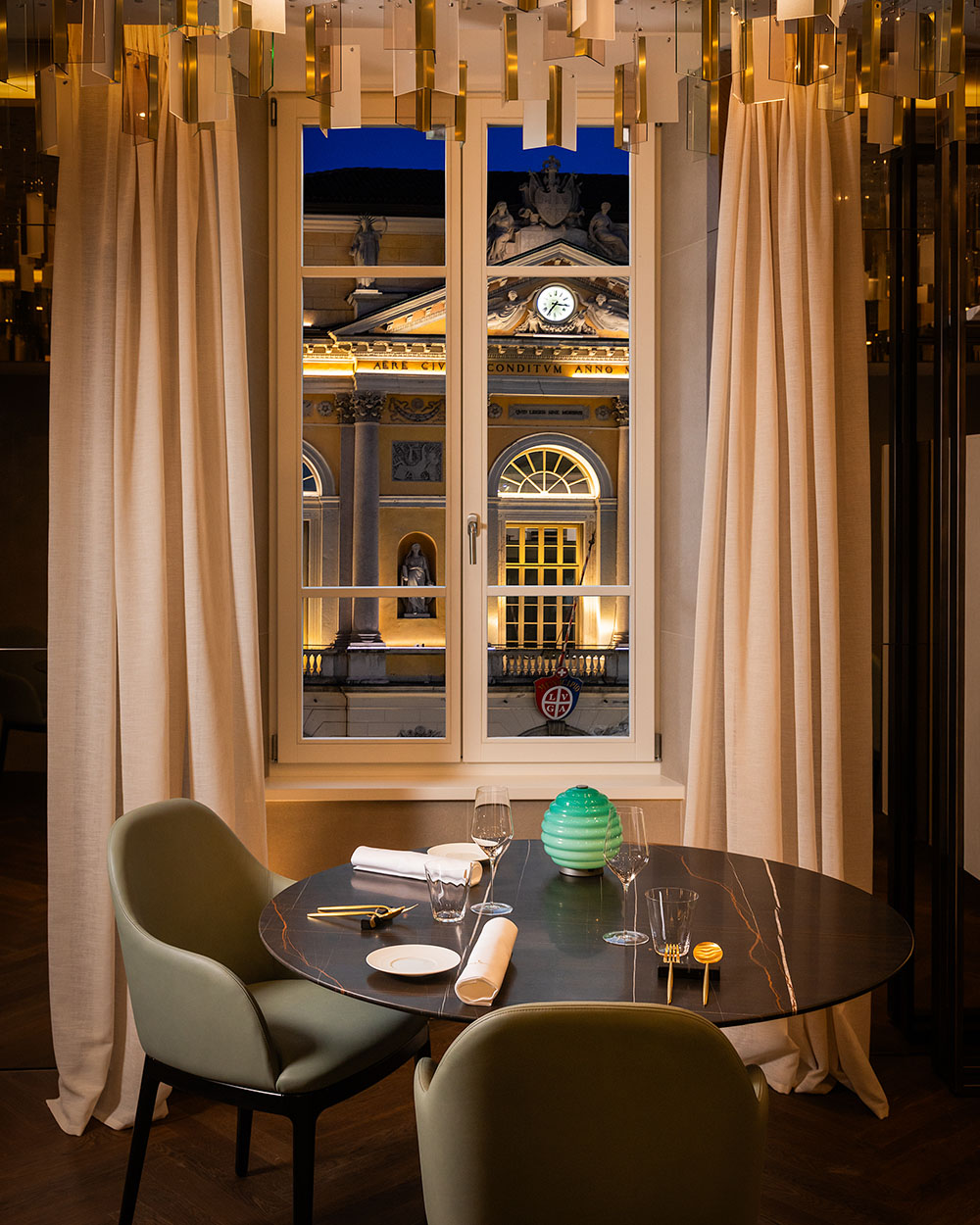 Il design del ristorante Meta di Lugano celebra l’eleganza firmata Rugiano. Protagonisti della sala sono i tavoli Liberty, con raffinati dettagli in metallo, abbinati alle iconiche sedie PocketP con rivestimento in pelle verde salvia.